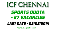 Integral Coach Factory (ICF under Ministry of Railways) recruitment against Sports Quota for the year 2013-2014. Applications are invited from Indian National candidates for the following posts against Sports Quota. The last date for receipt of application is 3rd February 2014.